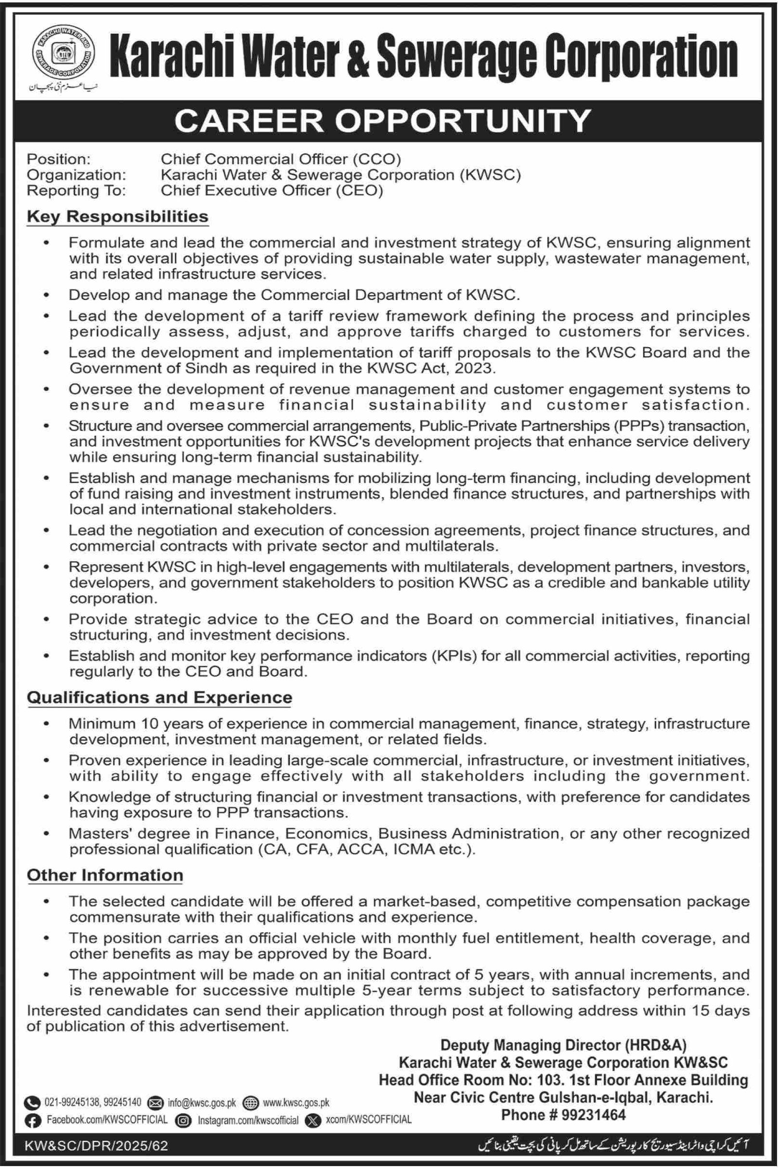 Karachi Water & Sewerage Corporation KWSC announced new jobs for the position of Chief Commercial Officer Cco. These jobs are related to Management category and Government jobs. The minimum qualification required for this job is Bachelor, Master, MS, BS.
