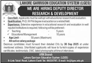 Lahore Garrison Education System LGES announced new jobs for the position of Deputy Director, Deputy Director Research, Deputy Director Development. These jobs are related to Management category and Government jobs. The minimum qualification required for this job is Mphil, Phd.