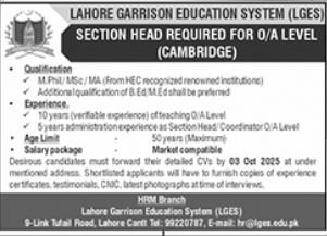 Lahore Garrison Education System LGES announced new jobs for the position of Section Head. These jobs are related to Education category and Government jobs. The minimum qualification required for this job is Mphil, M.ed, B.ed, MA, M.sc.