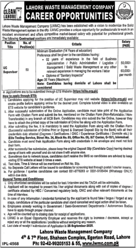 Lahore Waste Management Company announced new jobs for the position of Uc Supervisor. These jobs are related to Management category and Government jobs. The minimum qualification required for this job is Bachelor, BS.