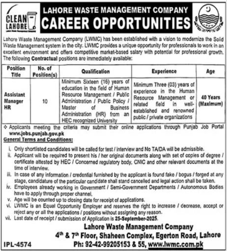 Lahore Waste Management Company announced new jobs for the position of Assistant Manager Hr. These jobs are related to Management category and Government jobs. The minimum qualification required for this job is Bachelor, Master, MS, BS.