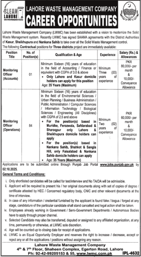 Lahore Waste Management Company announced new jobs for the position of Monitoring Officer Account, Monitoring Officer Operations. These jobs are related to Management category and Government jobs. The minimum qualification required for this job is Bachelor, Master, MS, BS.