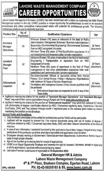 Lahore Waste Management Company announced new jobs for the position of Assistant Manager Operation, Assistant Manager Fleet, Enforcement Inspector. These jobs are related to Management category and Government jobs. The minimum qualification required for this job is Bachelor, Master, MS, BS.