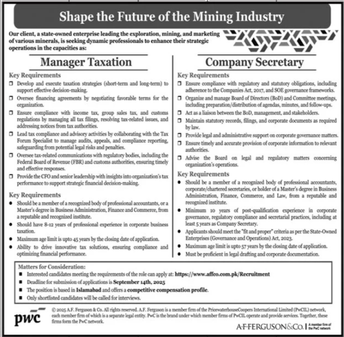 AF Ferguson & Co announced new jobs for the position of Manager Taxation, Company Secretary. These jobs are related to Management category and Government jobs. The minimum qualification required for this job is Bachelor, Master, MS, BS.