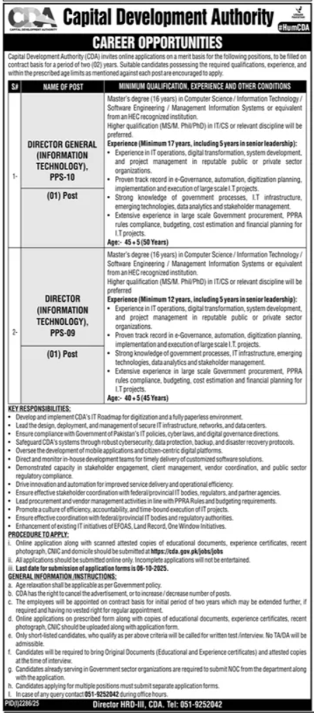 Capital Development Authority CDA announced new jobs for the position of Director General It, Director It. These jobs are related to Management category and Government jobs. The minimum qualification required for this job is Bachelor, Master, MS, BS.