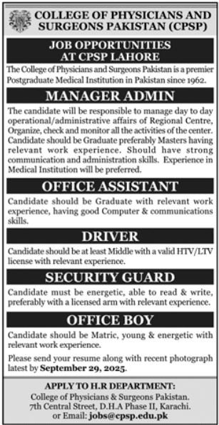 College of Physician and Surgeons Pakistan CPSP announced new jobs for the position of Manager Admin, Office Assistant, Driver, Security Guard, Office Boy. These jobs are related to Management category and Government jobs. The minimum qualification required for this job is Middle, Matric, Bachelor, Master.