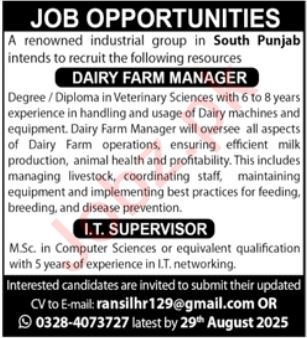 Industrial Group announced new jobs for the position of Dairy Farm Manager, It Supervisor. These jobs are related to Management category and Government jobs. The minimum qualification required for this job is Master, M.sc, Others.