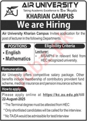 Air University announced new jobs for the position of Lecturer. These jobs are related to Management category and Government jobs. The minimum qualification required for this job is Mphil, MS.