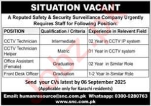 Security Surveillance announced new jobs for the position of Cctv Technician, Cctv Technician Helper, Office Assistant Female, Front Desk Officer. These jobs are related to Management category and Government jobs. The minimum qualification required for this job is Matric, Intermediate, Bachelor.