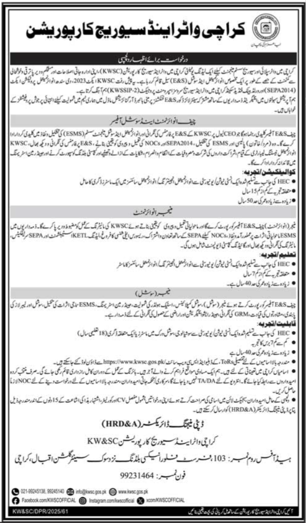 Karachi Water & Sewerage Corporation KWSC announced new jobs for the position of Chief Environment Social Officer, Manager Environment, Manager Social. These jobs are related to Management category and Government jobs. The minimum qualification required for this job is Bachelor, Master, MS, Others, BS.