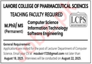 Lahore College of Pharmaceutical Sciences announced new jobs for the position of Teaching Faculty. These jobs are related to Management category and Government jobs. The minimum qualification required for this job is Mphil, MS.