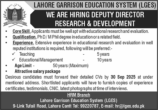 Lahore Garrison Education System LGES announced new jobs for the position of Deputy Director Research Development. These jobs are related to Education category and Government jobs. The minimum qualification required for this job is Bachelor, Master, Mphil, Phd.