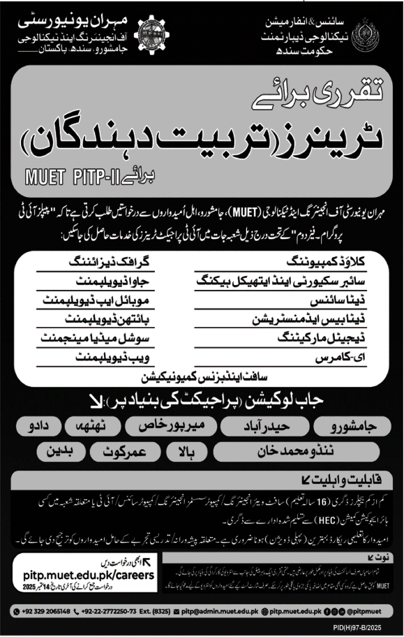 Mehran University of Engineering & Technology announced new jobs for the position of Training Program, Trainers. These jobs are related to Education category and Government jobs. The minimum qualification required for this job is Bachelor, Master, MS, BS.