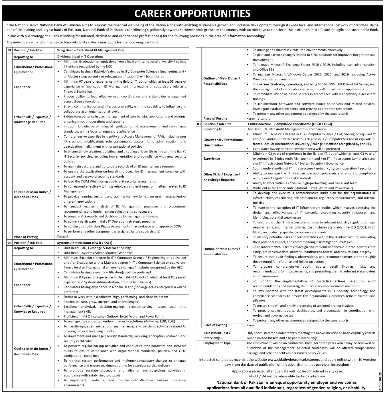 National Bank of Pakistan NBP announced new jobs for the position of Wing Head, Systems Administrator, It Infrastructure, 5g Welder. These jobs are related to Management category and Government jobs. The minimum qualification required for this job is Bachelor, Master, MS, BS.