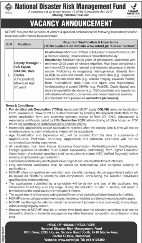 National Disaster Risk Management Fund NDRMF announced new jobs for the position of Deputy Manager, Gis Expert. These jobs are related to Management category and Government jobs. The minimum qualification required for this job is Bachelor, Master, MS, BS.