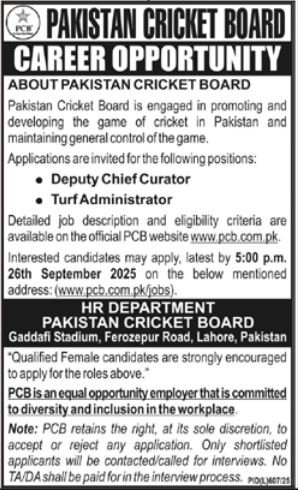 Pakistan Cricket Board PCB announced new jobs for the position of Deputy Chief Curator, Turf Administrator. These jobs are related to Management category and Government jobs. The minimum qualification required for this job is Bachelor, Master, MS, BS.