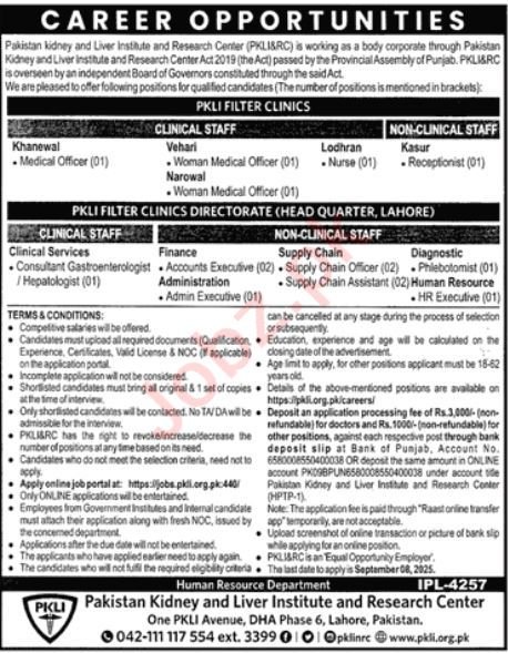 Pakistan Kidney And Liver Institute And Research Centre PKLI announced new jobs for the position of Medical Officer, Woman Medical Officer, Nurse, Receptionist, Consultant Gastroenterologist, Consultant Hepatologist, Accounts Executive, Admin Executive, Supply Chain Officer, Supply Chain Assistant, Phlebotomist, Hr Executive. These jobs are related to Management category and Government jobs. The minimum qualification required for this job is Intermediate, Bachelor, Master, MBBS.