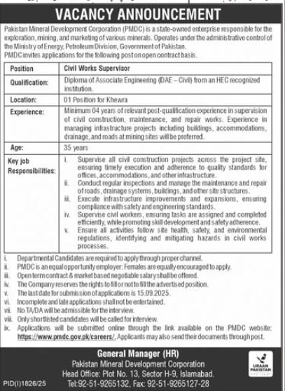 Pakistan Mineral Development Corporation announced new jobs for the position of Civil Works Supervisor. These jobs are related to Management category and Government jobs. The minimum qualification required for this job is Bachelor, Master, MA, MBA.