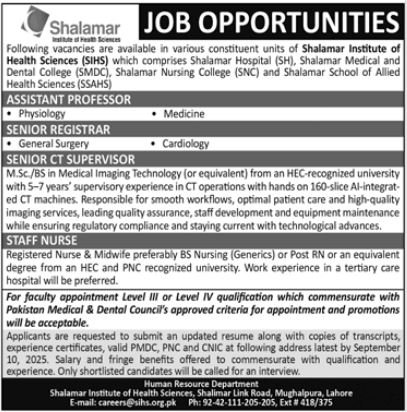 Shalamar Institute of Health Sciences announced new jobs for the position of Assistant Professor, Sr Registrar, Sr Ct Supervisor, Staff Nurses. These jobs are related to Management category and Government jobs. The minimum qualification required for this job is Mphil, Phd, M.sc, Others, BS.