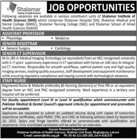 Shalamar Institute of Health Sciences announced new jobs for the position of Assistant Professor, Registrar, Ct Supervisor, Staff Nurse. These jobs are related to Education category and Government jobs. The minimum qualification required for this job is Bachelor, Master, Mphil, Phd.