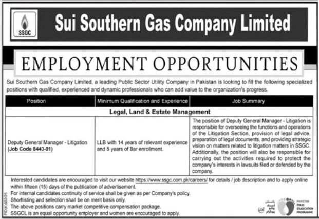 Sui Southern Gas Company Limited SSGC announced new jobs for the position of Deputy General Manager Litigation. These jobs are related to Management category and Government jobs. The minimum qualification required for this job is LLb.
