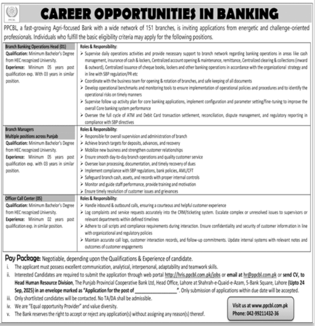 The Punjab Provincial Cooperative Bank Ltd PPCBL announced new jobs for the position of Branch Banking Operation Head, Branch Managers, Officer Call Center. These jobs are related to Management category and Government jobs. The minimum qualification required for this job is Bachelor.