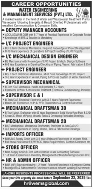 Water Engineering and Management Service Pvt Ltd announced new jobs for the position of Deputy Manager Accounts, Ic Project Engineer, Ic Mechanical Design Engineer, Project Engineer, Supervisor Mechanical, Supervisor Ei, Mechanical Draftsman, Import Officer, Store Officer, Hr Officer, Admin Officer. These jobs are related to Management category and Government jobs. The minimum qualification required for this job is Bachelor, M.com, MBA, DAE, ACCA, B.E, MS.