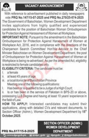 Women Development Department announced new jobs for the position of Woman Ombudsperson. These jobs are related to Management category and Government jobs. The minimum qualification required for this job is LLb.