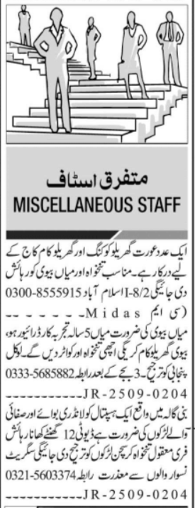 House announced new jobs for the position of Husband Wife, Cook, Driver, Laundry Boy, Cleaner, Sweeper. These jobs are related to House Staff category and Government jobs. The minimum qualification required for this job is Primary, Middle, Matric.