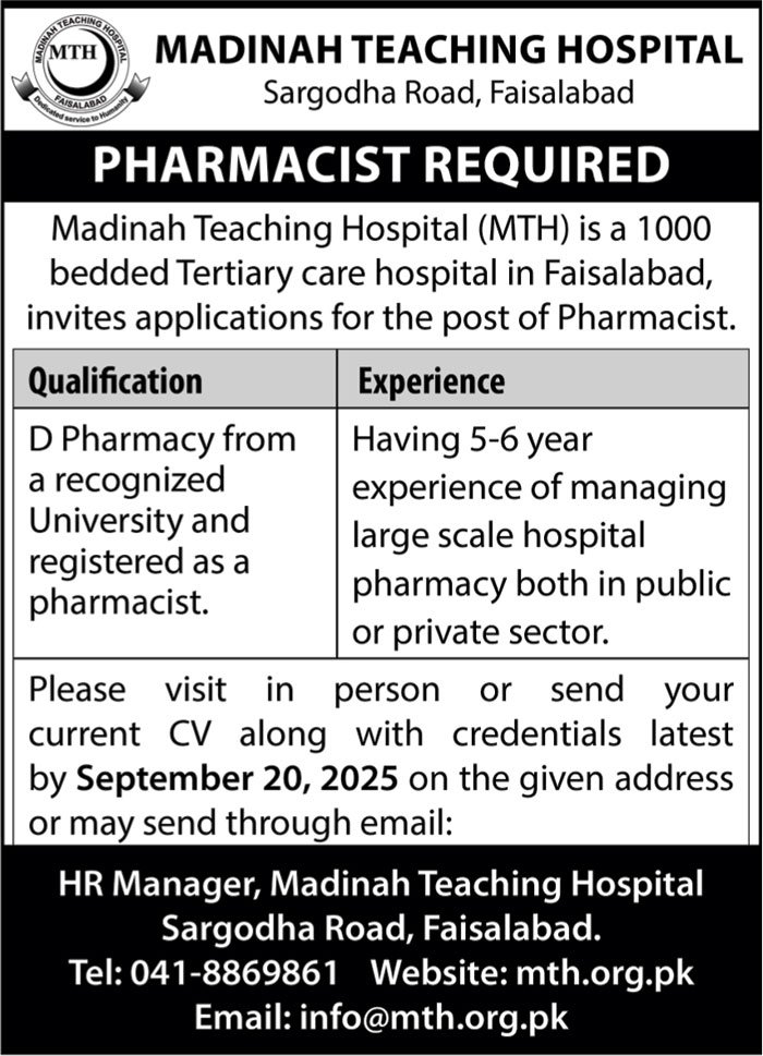 Madinah Teaching Hospital announced new jobs for the position of Pharmacist. These jobs are related to Management category and Government jobs. The minimum qualification required for this job is Intermediate, Bachelor.