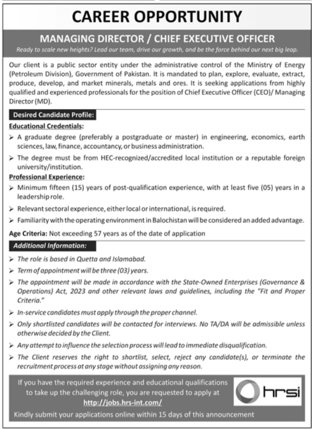 Human Resource Solution International HRSI announced new jobs for the position of Managing Director, Chief Executive Officer, Ceo. These jobs are related to Management category and Government jobs. The minimum qualification required for this job is Bachelor, Master.