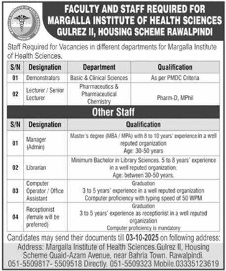 Margalla Institute of Health Sciences announced new jobs for the position of Demonstrator, Lecturer, Manager, Manager Admin, Librarian, Computer Operator, Office Assistant, Receptionist. These jobs are related to Education category and Government jobs. The minimum qualification required for this job is Bachelor, Master, Mphil, BA, MBA, Others, Pharma D.