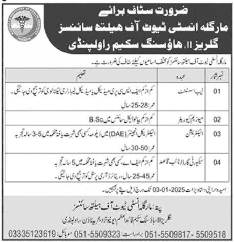 Margalla Institute of Health Sciences announced new jobs for the position of Lab Assistant, Museum Curator, Electrician, Security Guard, Naib Qasid. These jobs are related to Human Resource category and Government jobs. The minimum qualification required for this job is Intermediate, Bachelor, DAE, Others, BS.