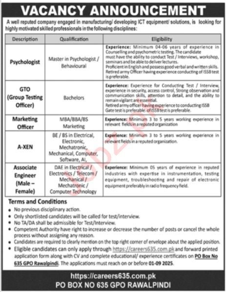 The job is located in Rawalpindi and it is necessary for candidate to read mentioned requirements for available vacancies. Jang newspaper published this job ad on 17 August, 2025. Last date to apply this job is 01 September, 2025