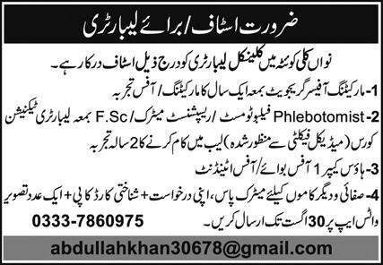 Clinical Laboratory announced new jobs for the position of Marketing Officer, Phlebotomist, House Keeper, Office Boy, Office Attendant, Sweeper, Sanitary Worker. These jobs are related to Medical category and Government jobs. The minimum qualification required for this job is Middle, Matric, Intermediate.