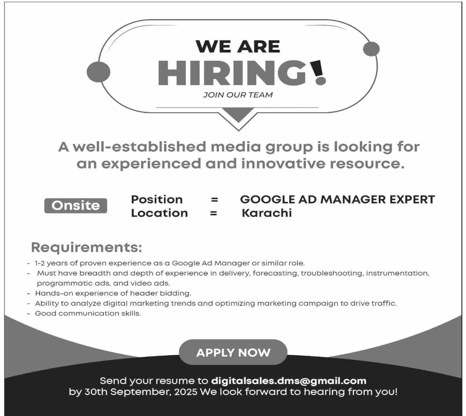 Media Group announced new jobs for the position of Google Ad Manager Expert. These jobs are related to Media category and Government jobs. The minimum qualification required for this job is Bachelor, Master, MS, BS.