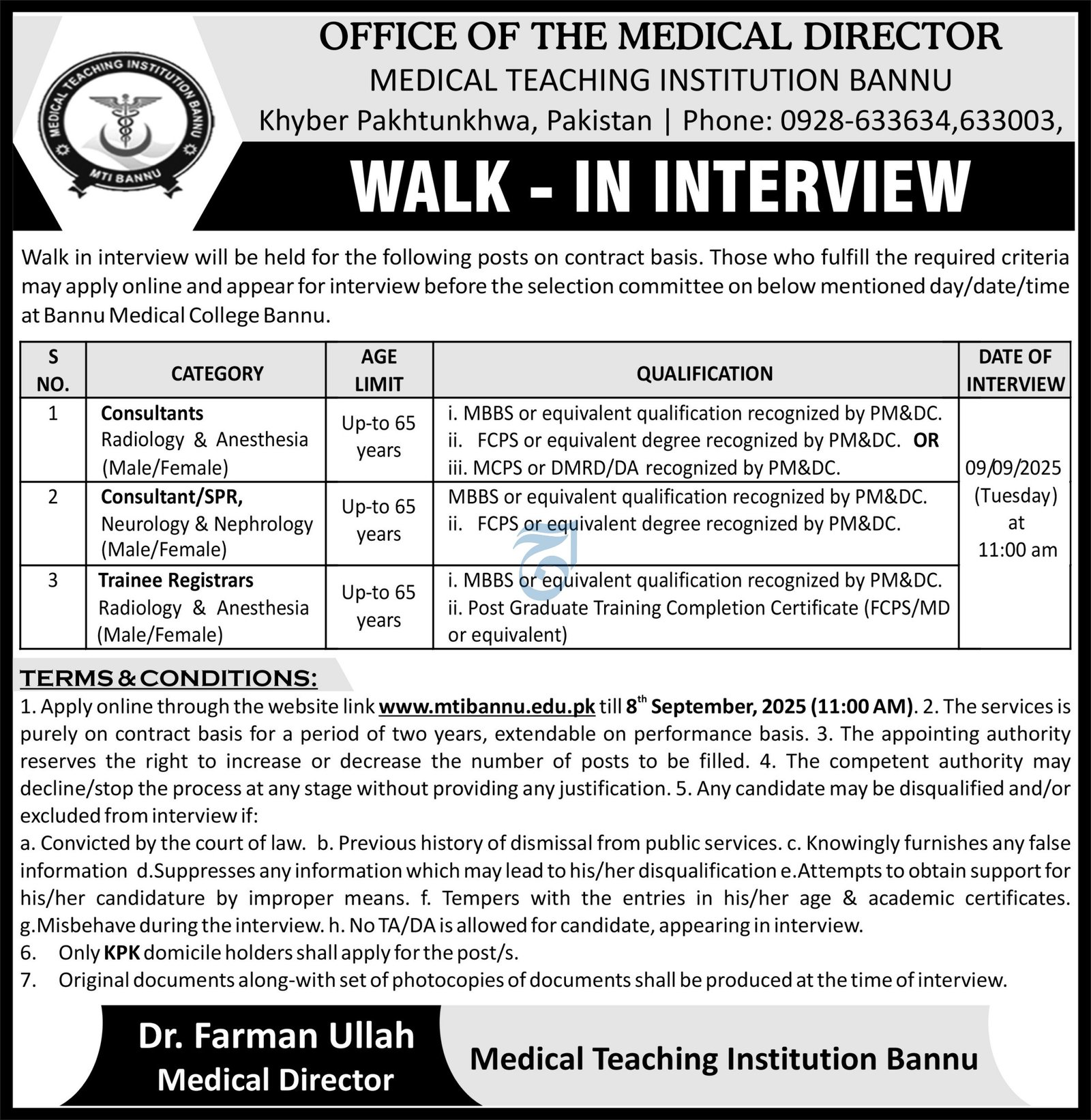 Medical Teaching Institution MTI announced new jobs for the position of Consultant Radiology, Consultant Anesthesia, Consultant Neurology, Consultant Nephrology, Trainee Registrar. These jobs are related to Medical category and Government jobs. The minimum qualification required for this job is MBBS.