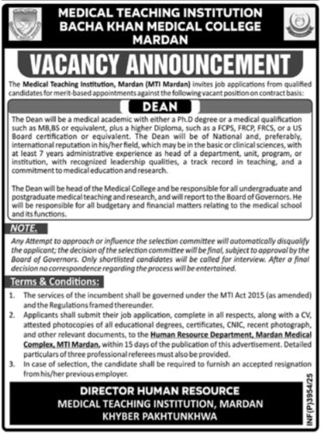 Medical Teaching Institution MTI announced new jobs for the position of Dean. These jobs are related to Education category and Government jobs. The minimum qualification required for this job is Bachelor, Master, MS, BS.
