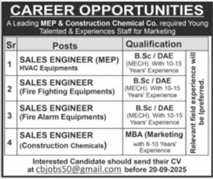 Construction Chemical Company announced new jobs for the position of Sales Engineer, Sales Engineer Mep, Sales Engineer Fire Fighting, Sales Engineer Fire Alarm, Sales Engineer Construction Chemicals. These jobs are related to Management category and Government jobs. The minimum qualification required for this job is Bachelor, MBA, DAE, Others, BS.