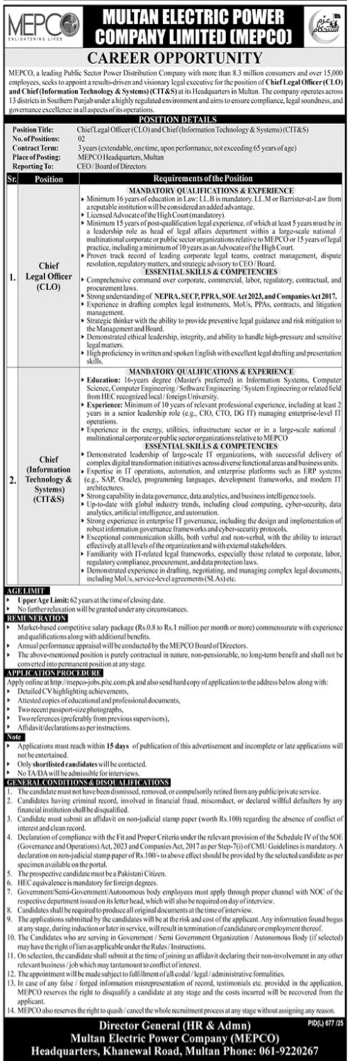 Multan Electric Power Company MEPCO announced new jobs for the position of Chief Legal Officer, Chief Information Technology Officer, Chief Information Technology Systems, Clo, Cit&s. These jobs are related to Management category and Government jobs. The minimum qualification required for this job is Master, LLb, LLM.