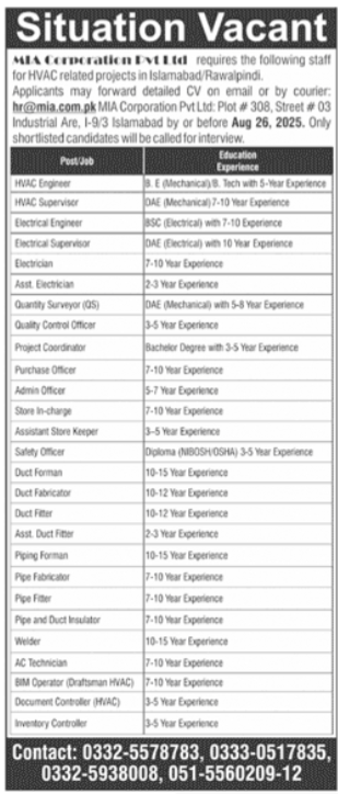 MIA Corporation Pvt Limited announced new jobs for the position of Hvac Engineer, Hvac Supervisor, Electrical Engineer, Electrical Supervisor, Electrician, Assistant Electrician, Quantity Surveyor, Quality Control Officer, Project Coordinator, Purchase Officer, Admin Officer, Store In Charge, Assistant Store Keeper, Safety Officer, Duct Foreman, Duct Fabricator, Duct Fitter, Assistant Duct Fitter, Piping Foreman, Pipe Fabricator, Pipe Fitter, Welder, Ac Technician, Bm Operator, Document Controller, Inventory Controller. These jobs are related to Management category and Government jobs. The minimum qualification required for this job is Primary, Middle, Matric.