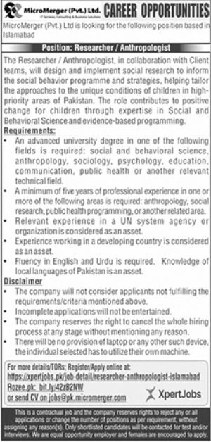 MicroMerger Pvt Ltd announced new jobs for the position of Researcher, Anthropologist. These jobs are related to Management category and Government jobs. The minimum qualification required for this job is Bachelor, Master.