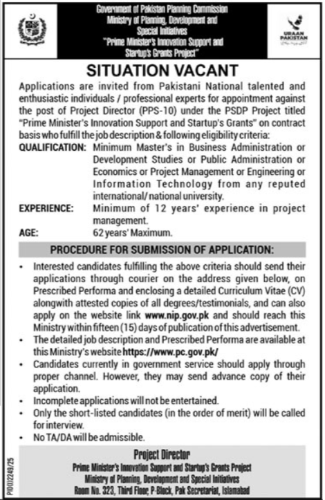 Ministry of Planning Development and Special Initiative announced new jobs for the position of Project Director. These jobs are related to Management category and Government jobs. The minimum qualification required for this job is Bachelor, Master, MS, BS.