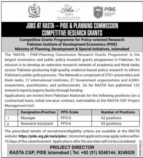 Ministry of Planning Development and Special Initiative announced new jobs for the position of Manager, Research Assistant. These jobs are related to Management category and Government jobs. The minimum qualification required for this job is Bachelor, Master, MS, BS.