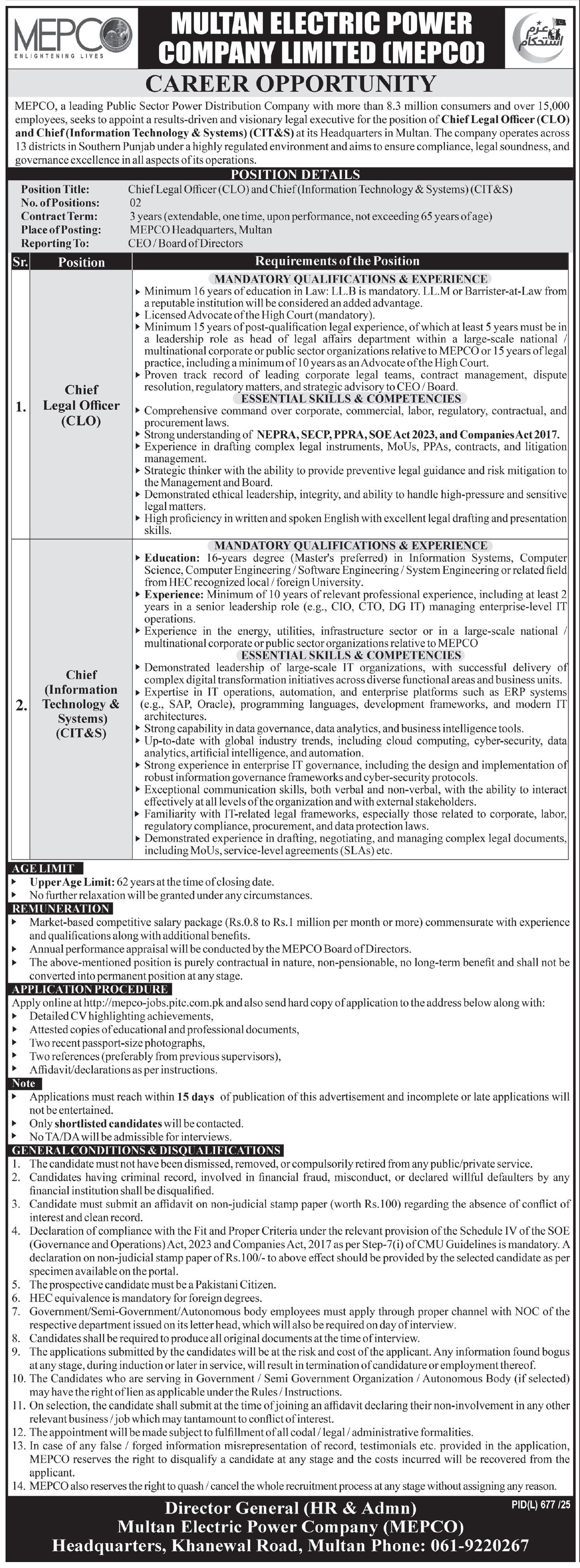 Multan Electric Power Company MEPCO announced new jobs for the position of Chief Legal Officer, Chief Information Technology Officer, Chief Information Technology Systems, Clo, Cit&s. These jobs are related to Management category and Government jobs. The minimum qualification required for this job is Master, LLb, LLM.