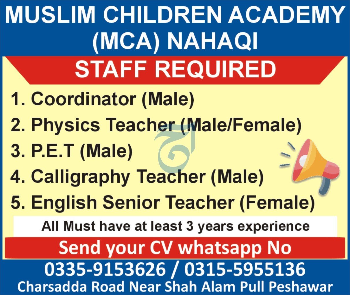 Muslim Children Academy announced new jobs for the position of Coordinator, Physics Teacher, Pet, Calligraphy Teacher, English Teacher, Male Staff, Female Staff. These jobs are related to Education category and Government jobs. The minimum qualification required for this job is Bachelor, Master, MS, BS.