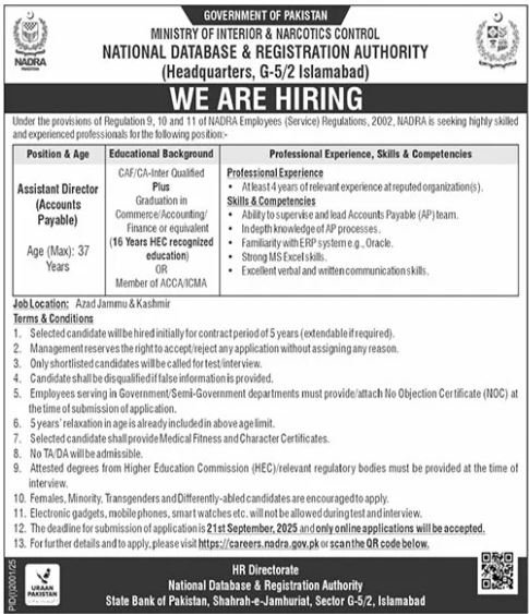 National Database & Registration Authority NADRA announced new jobs for the position of Assistant Director, Assistant Director Accounts Payable. These jobs are related to Management category and Government jobs. The minimum qualification required for this job is Bachelor, Master, ACCA, CA, Others.