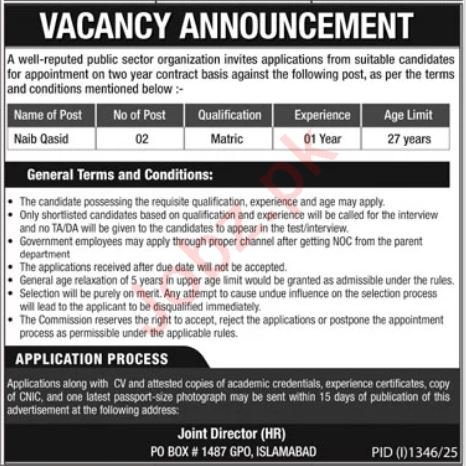 Public Sector Organization announced new jobs for the position of Naib Qasid. These jobs are related to Management category and Government jobs. The minimum qualification required for this job is Matric.