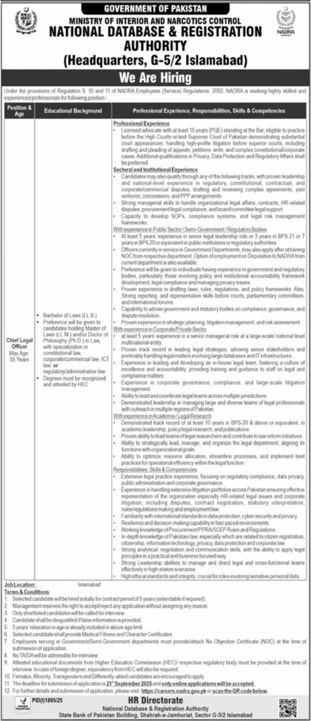 National Database & Registration Authority NADRA announced new jobs for the position of Chief Legal Officer Clo. These jobs are related to Management category and Government jobs. The minimum qualification required for this job is Bachelor, Master, MS, BS.