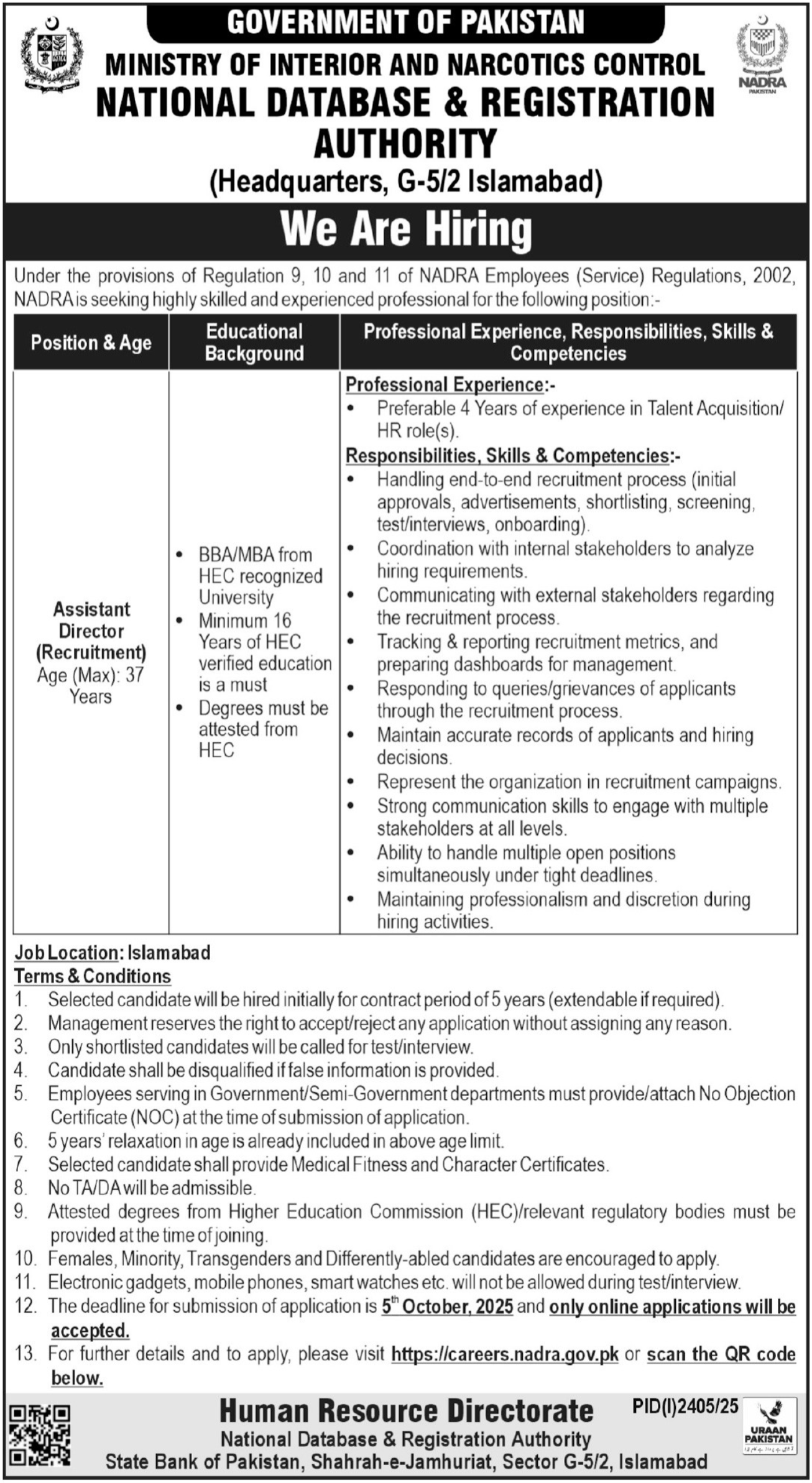 National Database & Registration Authority NADRA announced new jobs for the position of Assistant Director. These jobs are related to Management category and Government jobs. The minimum qualification required for this job is Bachelor, Master, MS, BS.